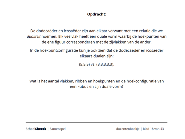 In de les "Samenspel" maken de leerlingen kennis met veelvlakken, leren hun eigenschappen zoals ribben, hoekpunten en vlakken, de hoekpuntconfiguratie en de duale vormen. Tussendoor worden een flink aantal veelvlakken gebouwd. De nadruk ligt in deze les dan ook op het ontwikkelen van meetkundig inzicht. Er wordt veel gebouwd en weinig gerekend. De les eindigt met een zelf te herkennen duaal vlak en het bouwen ervan op basis van de kenmerken die geleerd zijn. Leerlingen werken in duo's of zelfstandig. In de eindopdracht moet samengewerkt en overlegd worden om veelvlakken samen te voegen tot het masterpiece van deze les.