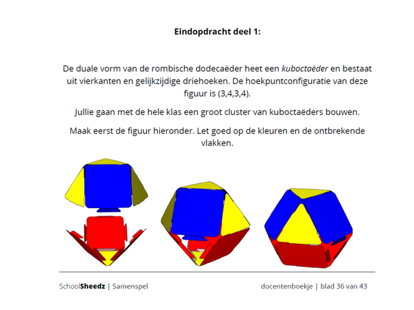 Het cluster bestaat uit 20 kuboctaëders, en het maken van de meesterproef van deze les is dus het leukst met hooguit 20 leerlingen. Anders kan niet iedere leerling zijn of haar kuboctaëder in het eindwerk kwijt.