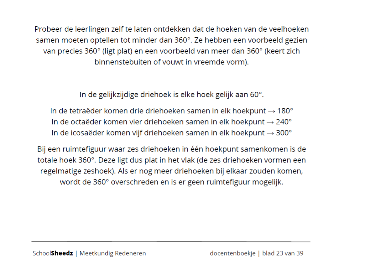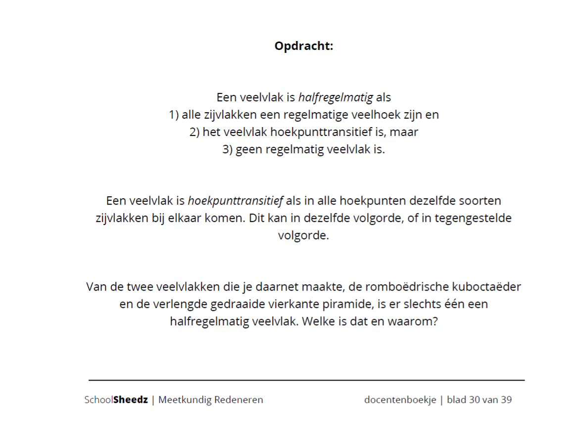 Een snufje bewijzen, een scheutje beredeneren en een flinke dosis experimenteren vormen de ingrediënten voor deze les. In deze les wordt het redeneren heel praktisch toegepast op regelmatige en halfregelmatige veelvlakken. Waarom zijn er maar vijf platonische lichamen? Hoeveel vlakken kunnen in een hoekpunt samenkomen? En waarom?